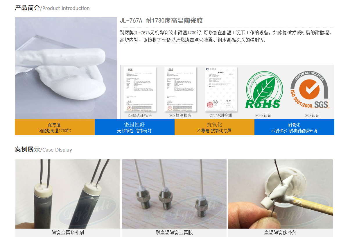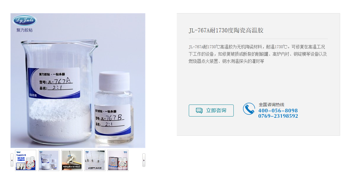 聚厲牌高溫修補膠,也叫高溫陶瓷膠,可耐溫1730℃高溫工況,適用于修補破損或斷裂的耐酸罐、高爐內襯、鋼錠模等設備以及燃燒器點火裝置、鋼水測溫探頭的灌封等。