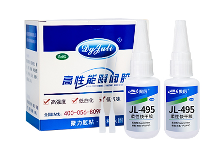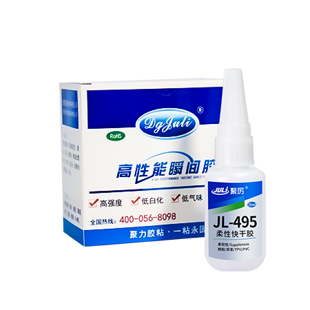 聚厲牌JL-495柔韌性瞬間膠水主要成份氰基丙稀酸酯, 符合環保標準,已通過歐盟ROHS標準和SGS檢測,具有高性能、中強度、中等硬度,柔韌性非常好,不會變脆,單組分、耐老化等優異性能,非常適合連續化生產線作業。
