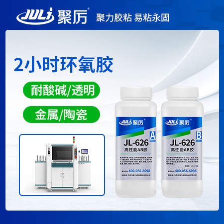 聚厲牌JL-626 2小時環氧樹脂AB膠為透明粘稠狀環氧樹脂粘接劑,可低溫或常溫固化,用于金屬、陶瓷、木材、玻璃及硬質塑膠之間的封裝粘接固化后粘接強度高、硬度較好,韌性佳;廣泛應用于電子電氣、工藝禮品、石油化工等行業。